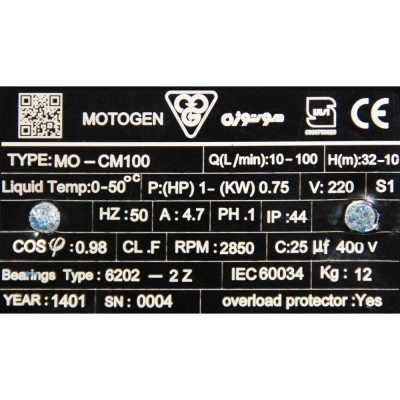 الکتروپمپ آب خانگی بشقابی موتوژن ۰۱/CM100 این محصول معادل CM۱۰۰ پنتاکس است. تولید کشور: ایران سازنده: شرکت موتوژن | Motogen •